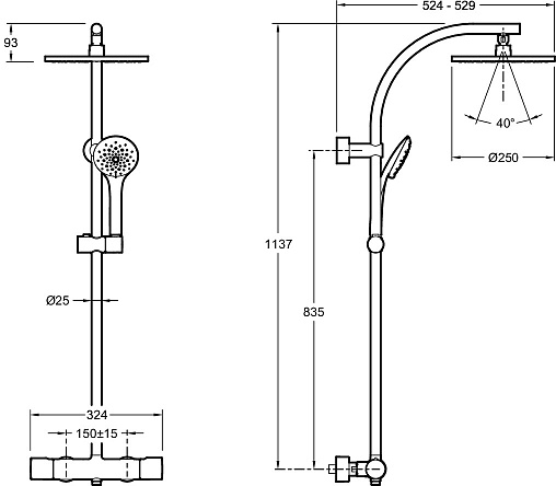 Amelie, душевая система без излива, 3 режима, 25 см, round, термостат, верхний душ, с лейкой, арт. E32851-CP, Jacob Delafon